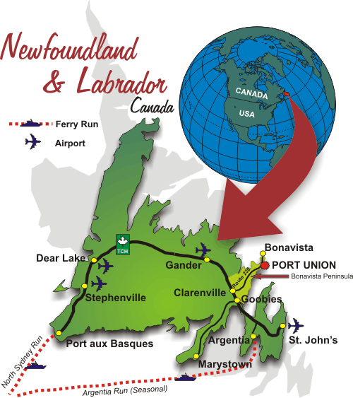 Port Union is approximatly a one-hour drive (100 km) from the Trans-Canada Highway at Clarenville. Take Route 230-A from Clarenville or Route 230 from the Discovery Trail Overpass, or Route 233 at Port Blandford. Look for the Historic Port Union signs on the highway and on Route 230.